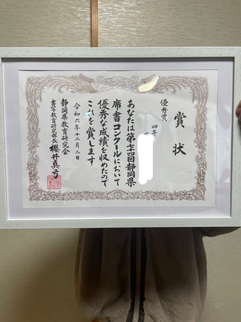 静岡県席書コンクールで書道教室花の四年生の女の子が優秀賞を受賞しました。